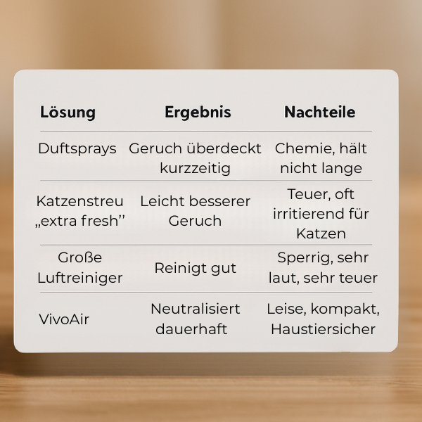 👉 VivoAir ist anders: neutralisiert Gerüche dauerhaft, läuft flüsterleise und ist absolut haustiersicher.